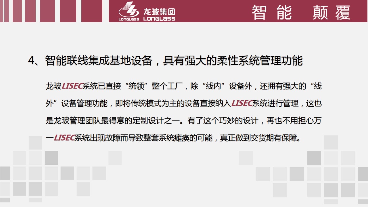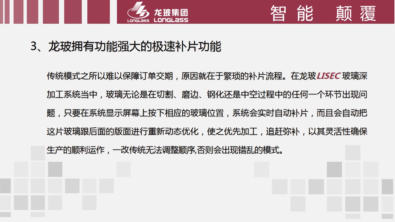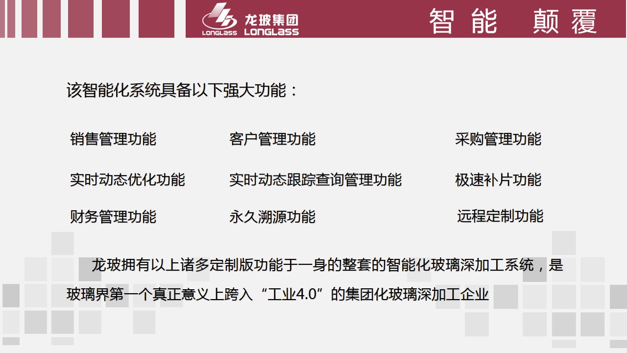广东隆玻科技集团以科技赢先机,率先融入“工业4.0”先进理念,引进了全球最先进LISEC智能化玻璃深加工生产系统。该智能化玻璃深加工系统整合了LISEC全球100条玻璃生产系统所有优点,历时近两年时间,成功打造出智能化程度最高、功能最齐全、设计最先进的智能化玻璃深加工系统。同时拥有销售管理功能、客户管理功能、采购管理功能、实时动态优化功能、实时动态跟踪查询管理功能、极速补片功能、财务管理功能、永久溯源功能、远程定制功能于一身的智能化玻璃深加工生产系统,是玻璃界第一个真正意义上跨入“工业4.0”的集团化玻璃深加工企业。