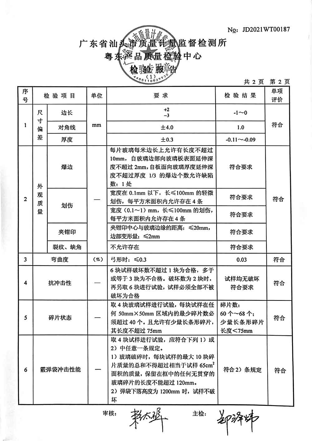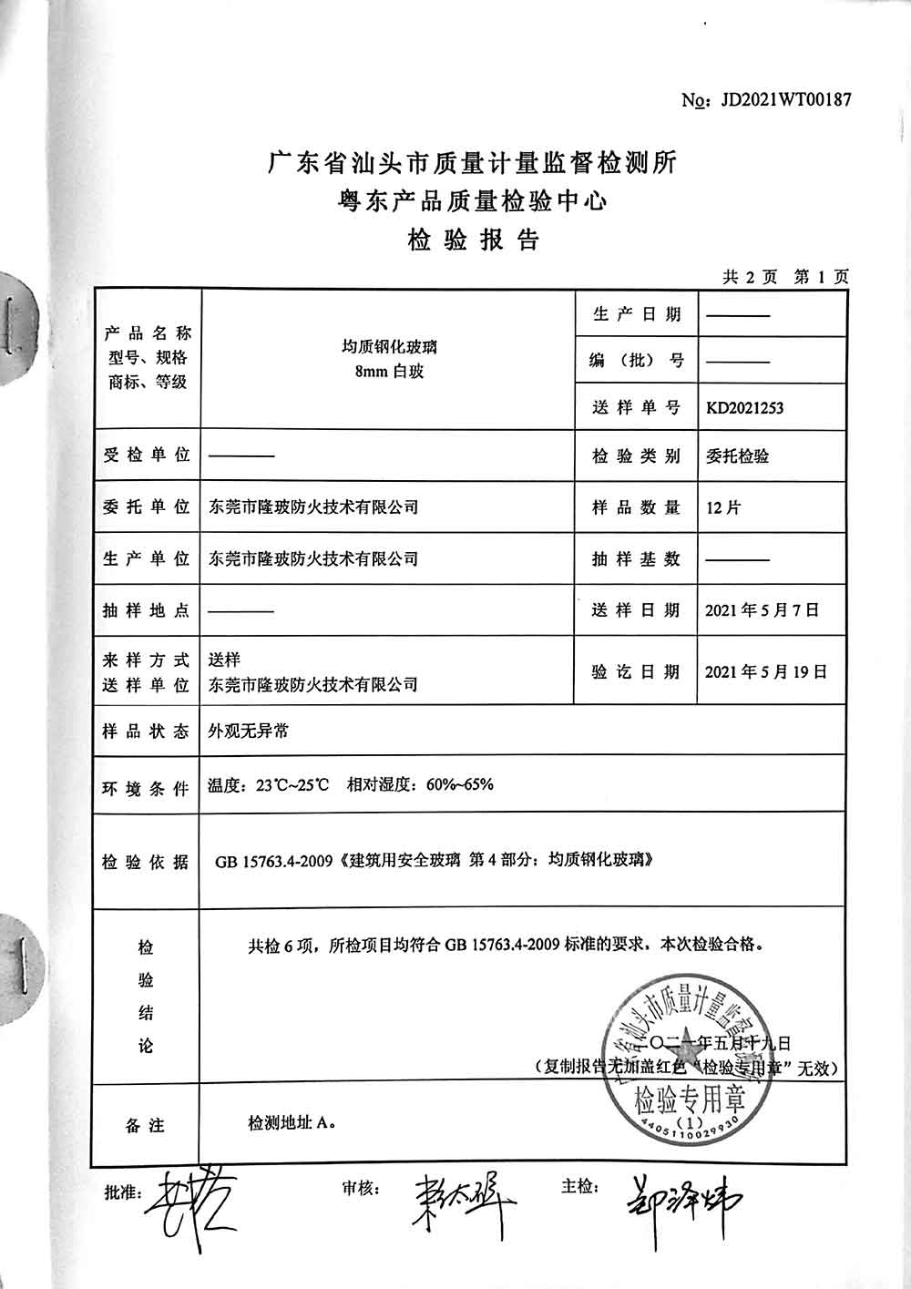 隆玻产品的各项技术指标均达到国家标准,通过国家检测认证机构检测认定,取得国家检验报告,所有产品均通过强制性产品认证。
