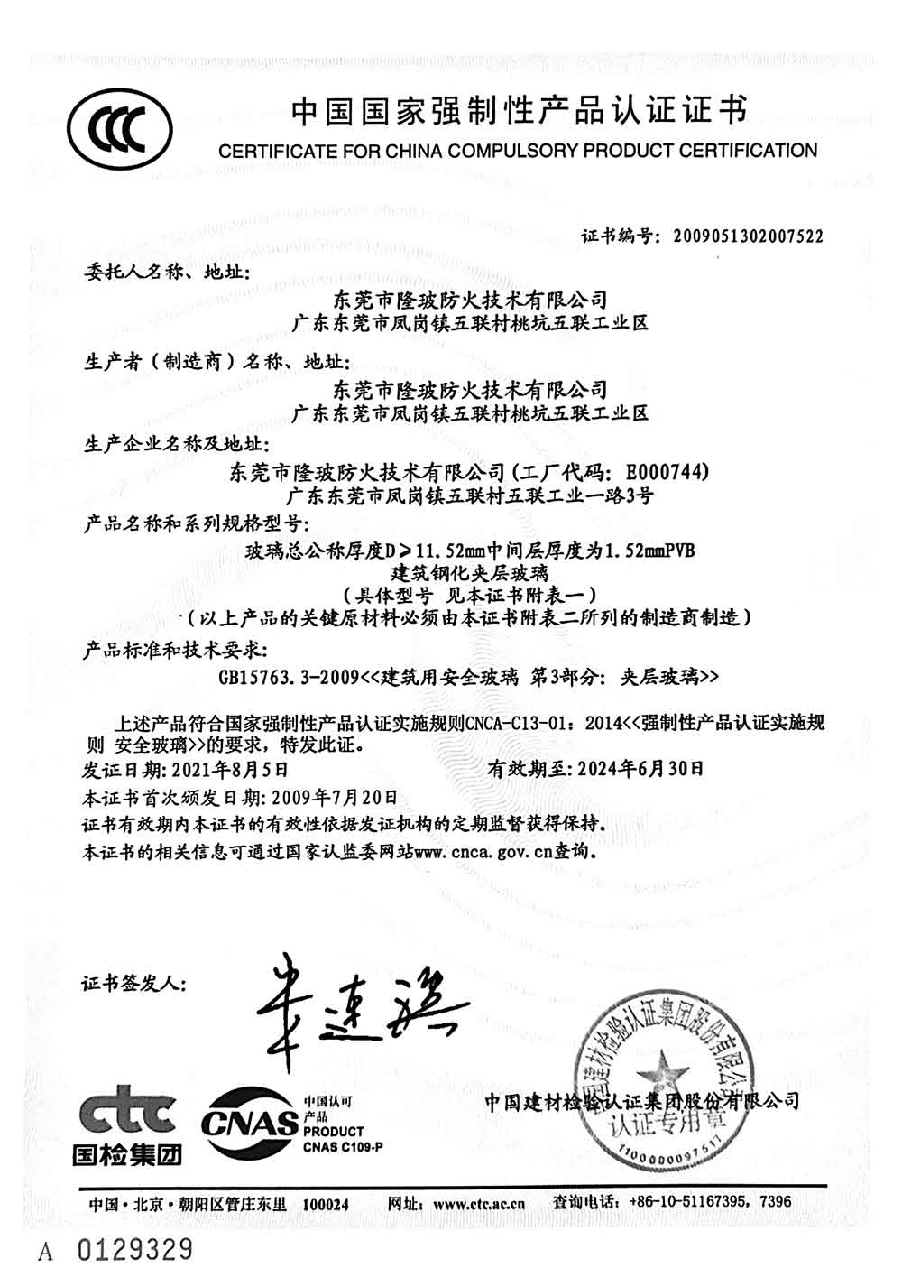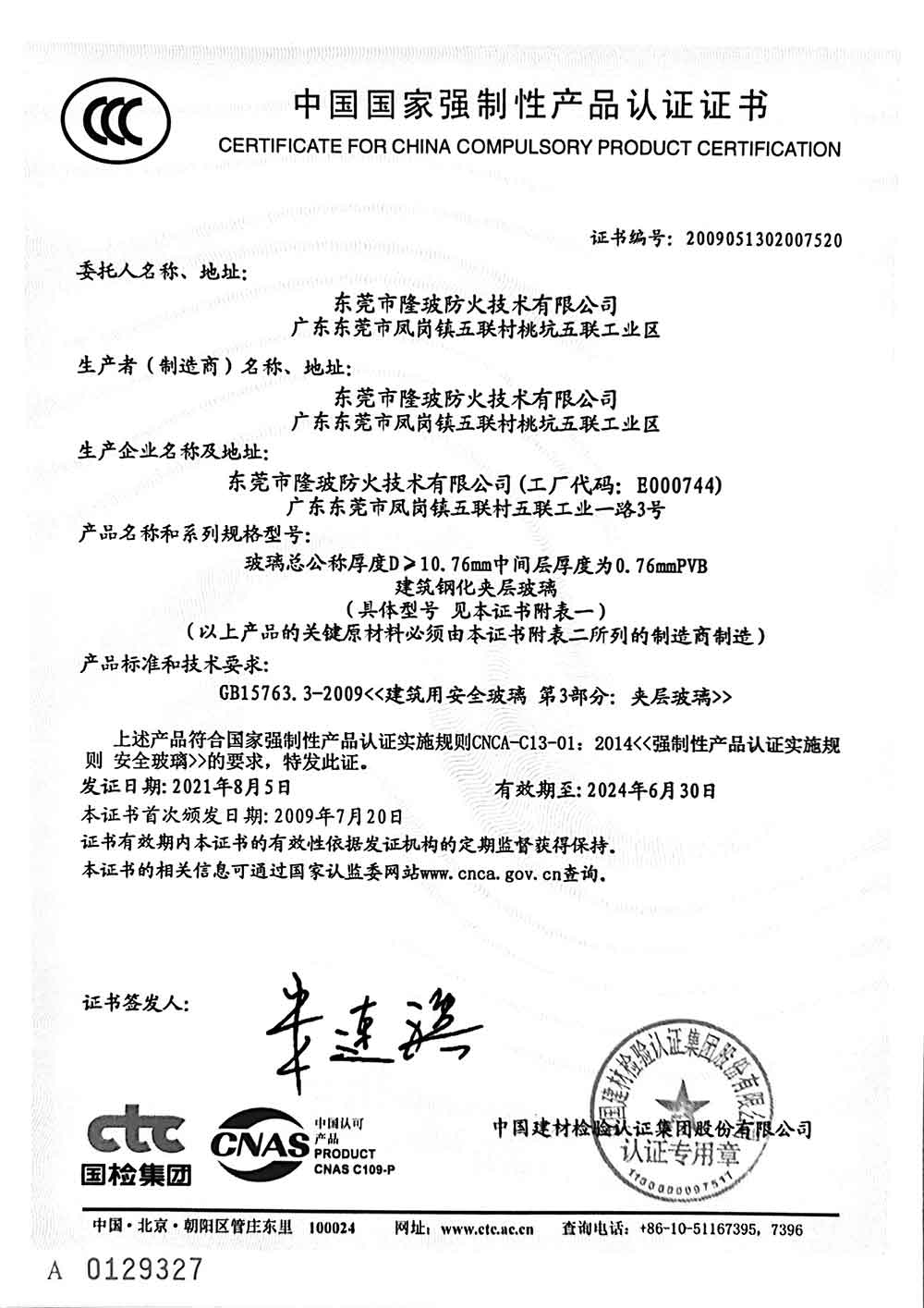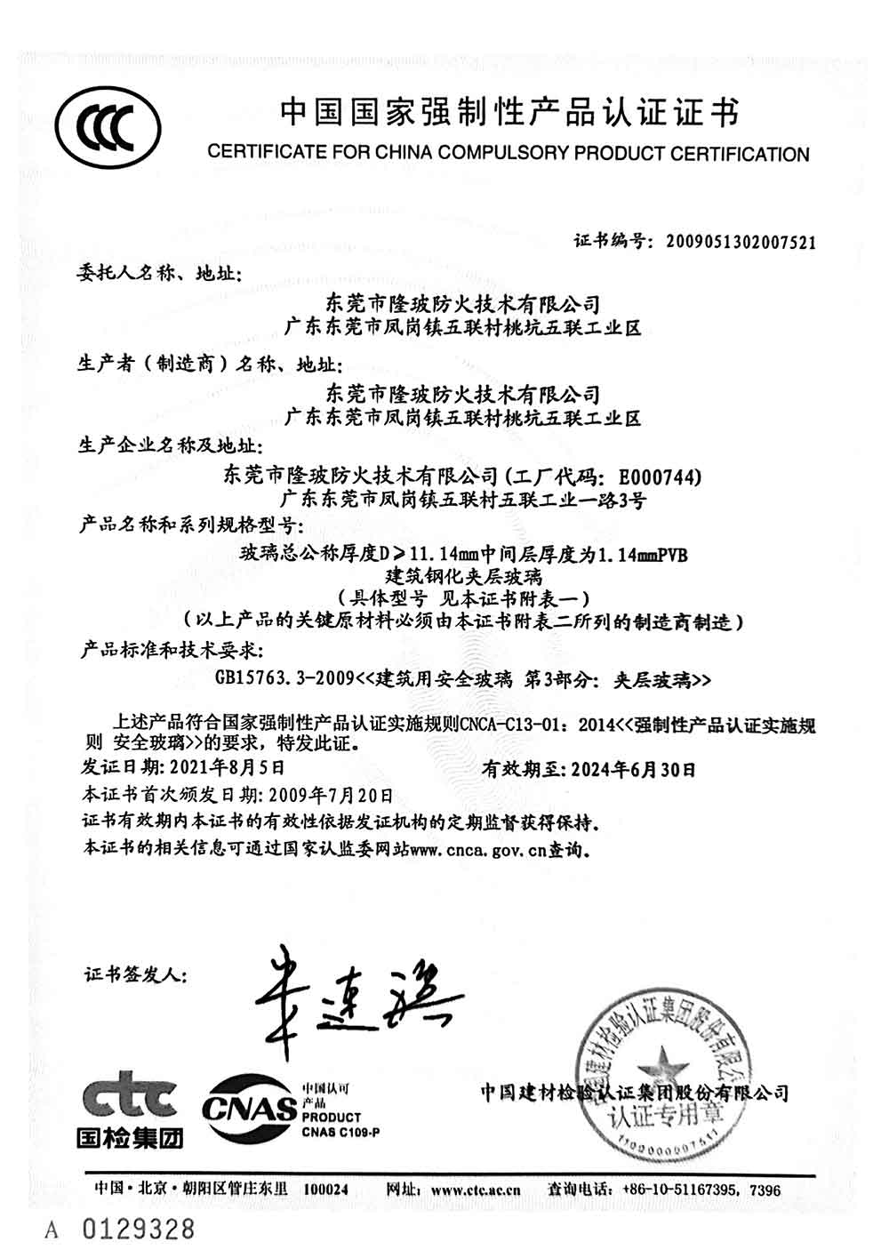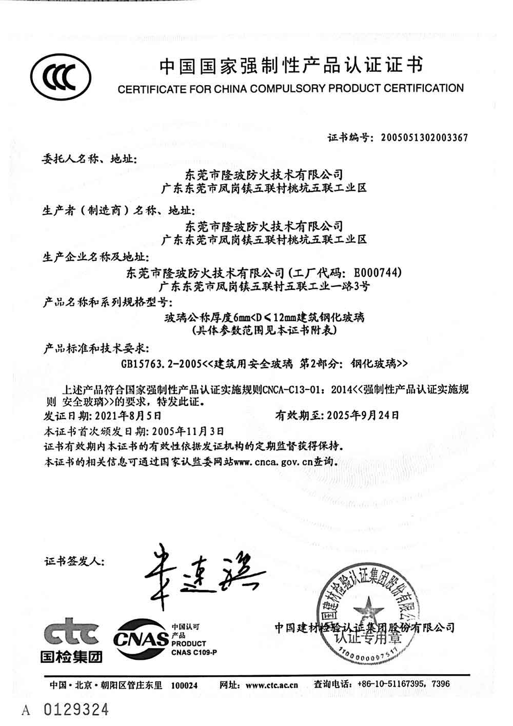 东莞隆玻2021年3C认证证书