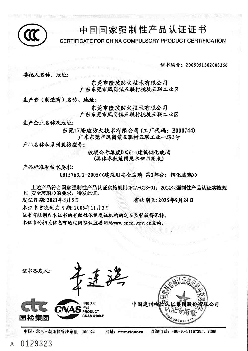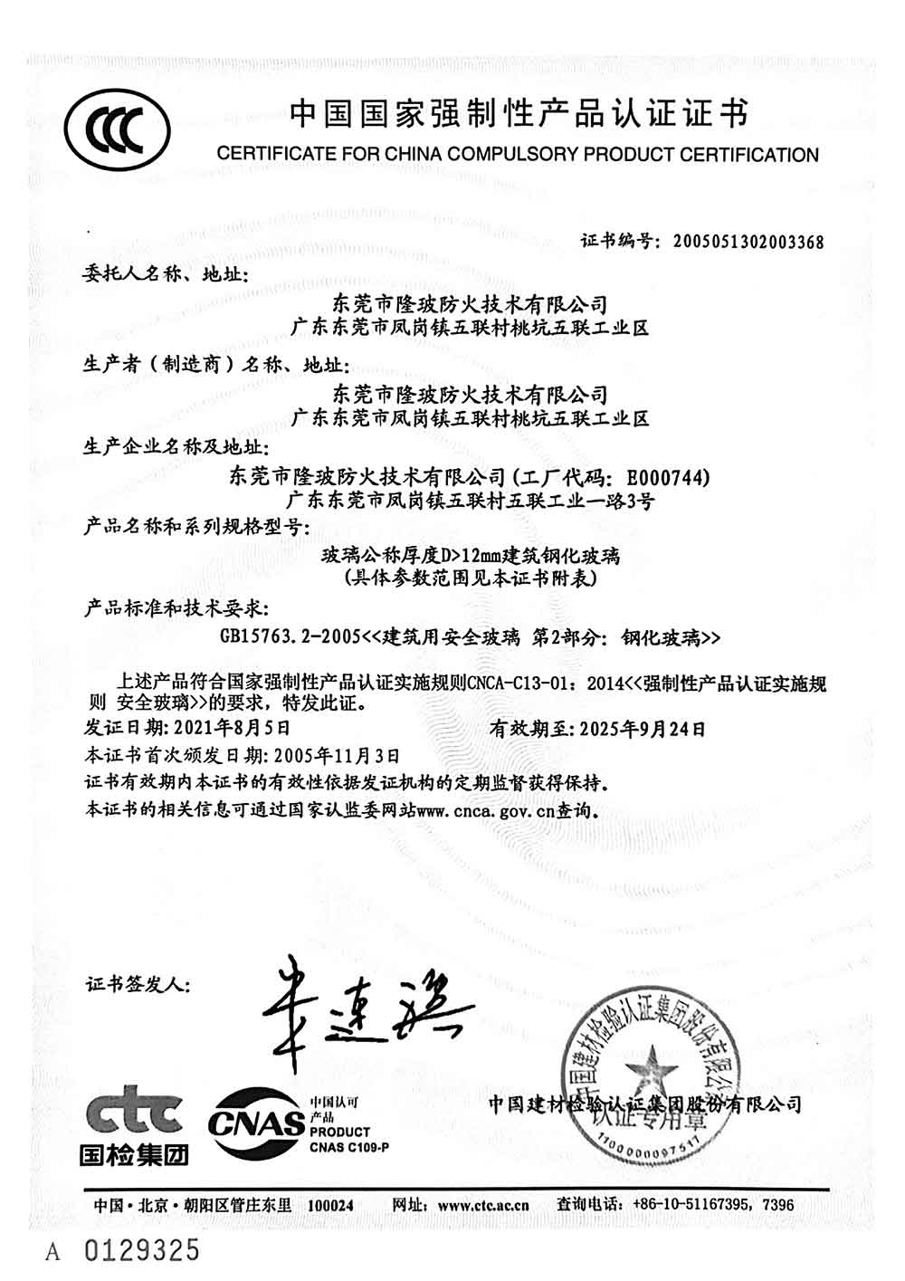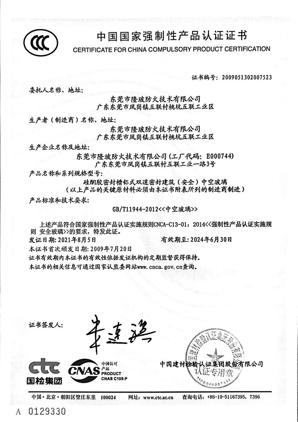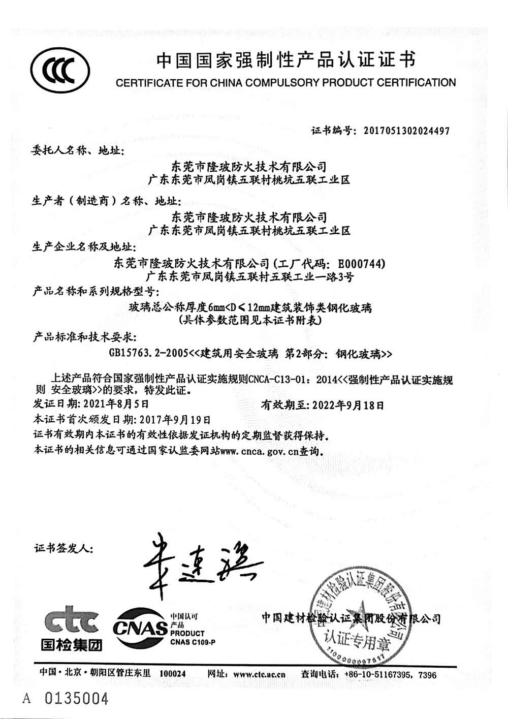 东莞隆玻2021年3C认证证书