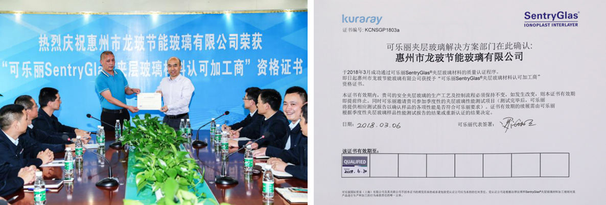 近日,隆玻集团旗下“惠州市隆玻节能玻璃有限公司”传来喜讯,公司于2018年3月成功通过可乐丽SentryGlas®夹层玻璃材料的质量认证程序,送样的测试结果全部满足可乐丽公司对于“合格SentryGlas®加工商”的送样样品性能检测要求,获得“可乐丽SentryGlas®夹层玻璃材料认可加工商”资格证书,并举行了证书授予仪式。这标志着隆玻集团正式成为国内为数不多的通过该认证、可采用SentryGlas®夹层玻璃材料生产高性能夹层玻璃的生产厂家,这是对隆玻集团20多年来深耕玻璃行业雄厚实力的又一力证。同时,这将进一步满足市场对安全玻璃需求的增长及对玻璃安全性、耐久性、美观性等方面的需求,大大拓展了夹层玻璃的性能,有利于促进整个安全玻璃行业发展。